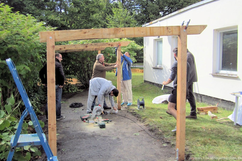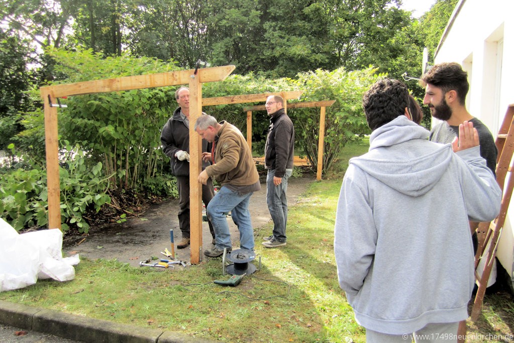 Vor einigen Tagen wurde gemeinsam mit den Syrern ein Fahrradunterstand gebaut. Der Amtsausschuss hatte dem kurzfristig zugestimmt, das Material wurde mit Spendengeldern finanziert. Bislang sind über 1880,-€ auf dem Spendenkonto eingegangen. Aber auch sehr viele Sachspenden erreichen Neuenkirchen: Fahrräder, Möbel, Geschirr, Lehrmaterial und Bekleidung. Ein Teil der Syrer ist mittlerweile nach ihrer Anerkennung als Flüchtling in andere Landesteile zu Bekannten oder Verwandten weitergezogen, vier haben Wohnungen in Greifswald gefunden. Der Umzug in neue Wohnungen in Greifswald wurde organisiert und die Wohnungen renoviert. Herzlichen Dank an alle Helfer und Unterstützer!